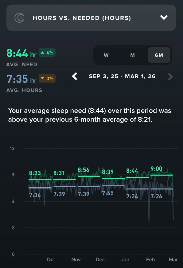 Sleep Need vs Actual Sleep (WHOOP, 6 months)
