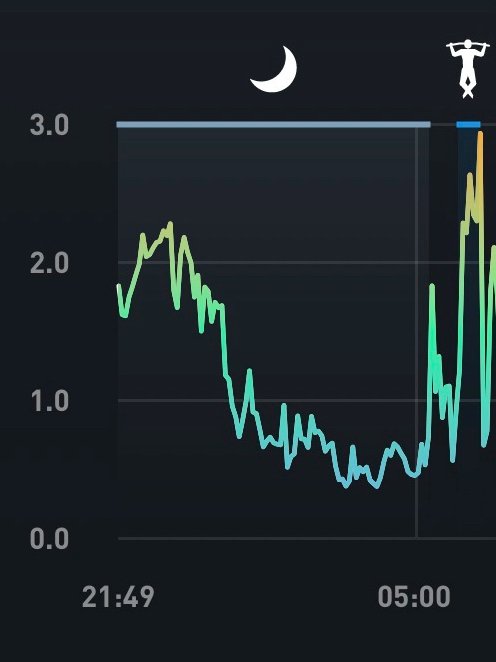 I started waking up at night again — usually around 1:00 AM or 3:00 AM — and then I can lie there for almost two hours, just staring into the darkness and counting crows. It is not dramatic, but it is very noticeable. And of course, it immediately shows up in the stats on the screenshot: sleep quality drops, recovery drops, overall resource drops.
