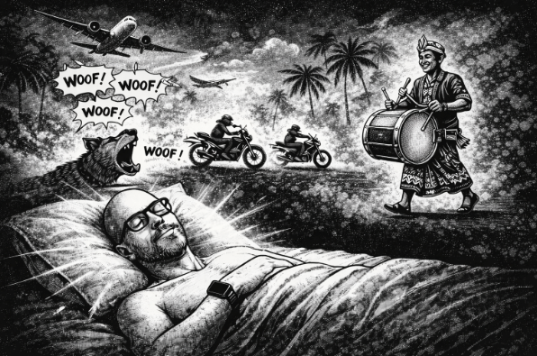A typical Bali night: paradise on the postcard — and barking as a service in real life.
